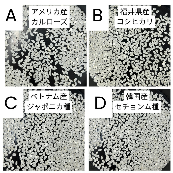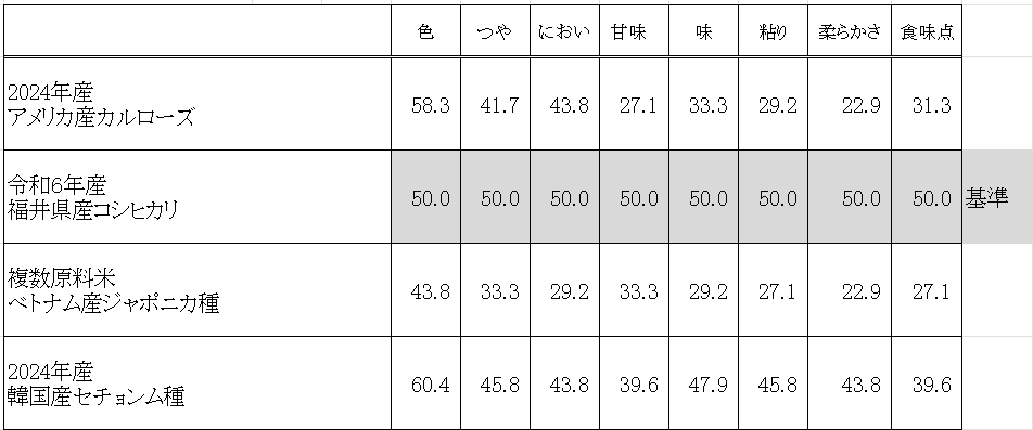 一方、アメリカ産カルローズやベトナム産ジャポニカ種は福井県産コシヒカリよりも硬く粘り気が無いと感じる人が多い結果となりました。