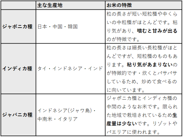 お米の種類は大きく分けて「ジャポニカ種・インディカ種・ジャバニカ種」という3つの種類に分類されます。