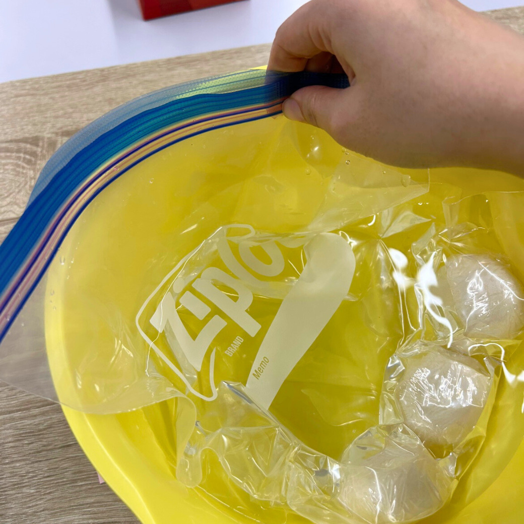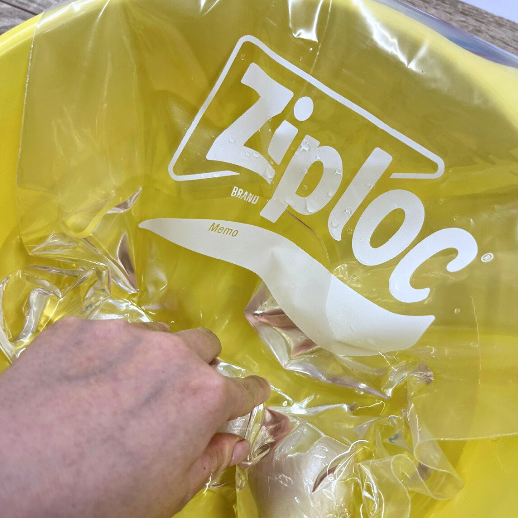 保存袋ごとボウルに入れた水に沈め袋の口をギリギリまで水面に出した状態で閉じると、簡単に空気を抜くことができます。
