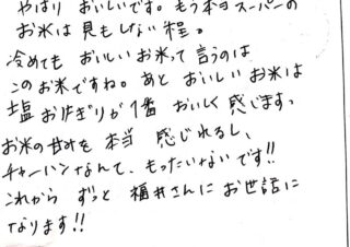いつもおいしいお米ありがとうございます。福井のお米はみんなおいしく、選ぶのが楽しくてしょうがないです。今回は、福井コシヒカリ無洗米、甘くてもっちり、ミルキークイーンに近いのかも。毎朝のごはん、お弁当に本当においしくいただいています。次は、何にしようかな、、楽しみです。