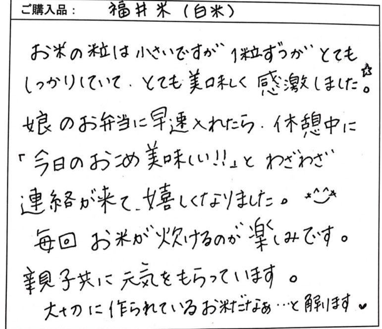 他のお米を食べた時に「福井の米屋」さんのミルキークイーンのおいしさに気付きます。 2021.01.20 2021.01.07 いつもミルキークイーンおいしく食べています。これに慣れてしまいこれが普通になってしまい、他のお米を食べた時に「福井の米屋」さんのミルキークイーンのおいしさに気付きます。 購入いただいた商品 ミルキークイーン 白米 10kg 福井県大野産 福井の米屋福井県の中でも特に美味しいお米がとれる大野市産で、もちもちが特徴のミルキークイーン、とても美味しいですよね。とても気に入っていただけて嬉しいです!ぜひまたのご利用をお待ちしています!